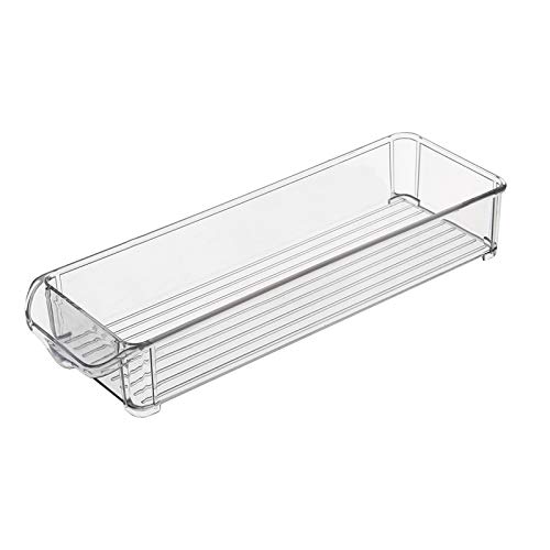 Although this clear bin was a little on the pricer side at about $10/bin as compared to other simple clear bins, the quality and design made it worth it since it’s something that’s going to be used multiple times a day for a long time. I really like how the handle allows for the fingers to go underneath to be able to easily pull it out of the refrigerator that also helps to maintain a grip on it with even one hand, much better than ones I have seen where there is a cut out oval shape for a handle that reportedly is often rough and scratchy. This one also looks like it belongs in the refrigerator, as though it came with it, because it looks clear and more like the drawer that came with it already because of its design. I have it on the glass shelf right underneath a left-to-right sliding plastic drawer that came with my new refrigerator, and when you open the fridge door, it looks like it belongs and isn’t just a tote placed on the shelf. I’m very happy with this shelf, and I also wish it came in a size that was just a bit wider than this, maybe the size of this one plus the one that fits cans, and then it would be the perfect width of half the refrigerator shelf and match the drawers in width that come with refrigerators perfectly. Also, if they made one that was a bit wider and also an inch or two taller, I would have purchased that one as well so that it can hold more loose items vertically as well. I’m very pleased with this, though, as the plastic doesn’t bend and is not cheap like a lot of other clear plastic bins that are half the price. You won’t be disappointed with the quality, that’s for sure. The picture I took was of the bin placed on the top shelf so I could take a better picture of it, but I normally place it on the bottom under the drawer that came with the refrigerator so it looks like a double-decker drawer system.