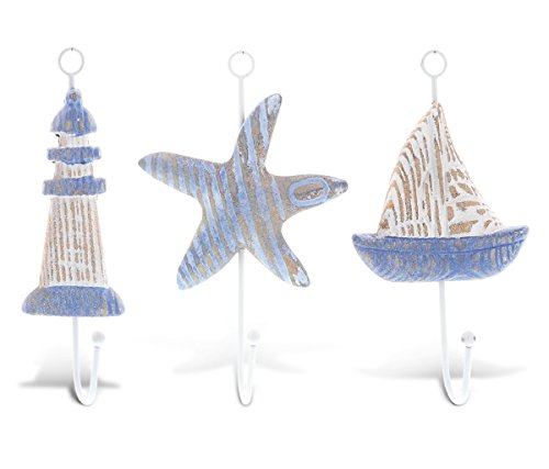 - BRING THE BEACH TO YOUR HOME - This beautiful wooden ocean beach themed hooks will store and organize your clothes, umbrellas, bags, towels, and many more. A 3 piece set of nautical inspired wall hooks featuring a sailboat, lighthouse & starfish.