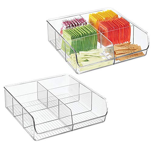 Streamline and declutter kitchen spaces with the Double Wide Kitchen Organizer Bin from mDesign. The organizer has six separate compartments that can be used to store tea, sugar packets, soup mixes, seasoning packets, coffee pods and baking supplies including cookie cutters, icing tubes, confectioner's sugars, dry pudding mixes and more. A ribbed pattern on the base helps keep the bin in place. The open tops and sloped design on the front panel make it easy to see and grab what you need, right when you need it!