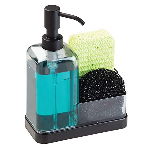 The mDesign Kitchen Soap and Sponge Caddy is a stylish accessory for your kitchen space. This easy-to-operate soap dispenser will complement any modern kitchen. The dispenser is easy to refill with the removable pump head and wide opening. The attached side caddy holds sponges, scrubbers, and brushes in one convenient spot.